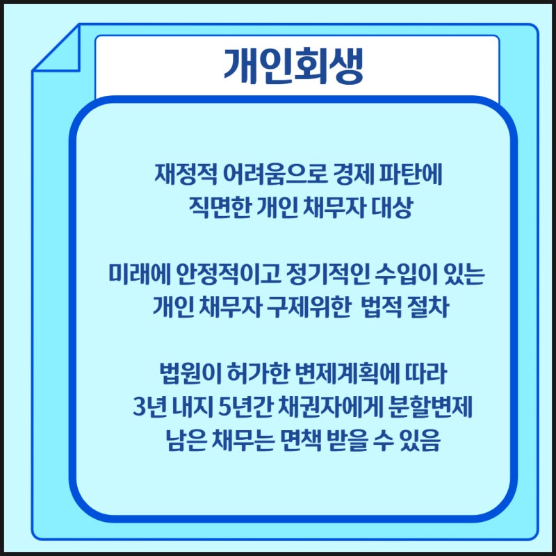 개인회생절차는 아주 간단하게 요약하면 법원에 채무조정신청서를 접수하고 심사를 통해 빚탕감 결정을 받으면 빚을 나눠 상환하는 절차라고 했습니다. 다만 법률에 따라 자격요건에 대해 상세하고 면밀하게 심사가 이뤄지기 때문에 회생사건 경험이 많은 법률 조력자의 튼튼한 조력을 받아야 사건이 기각되지 않고 법원의 추경명령에 대응을 공고히 해 빚을 더 많이 탕감해 회생에 성공할 수 있다고 했습니다.높은 탕감률을 적용받아 빚을 최대한 탕감해 빚을 해결하는 것이 채무자가 회생을 하는 가장 큰 목적이기 때문에 사전에 개인회생절차를 제대로 이해하고 신청하는 것이 중요하다고 했습니다. 하지만 사건을 진행하면서 어려운 법률 용어가 많기 때문에 다소 어렵게 느껴질 수 있지만 기본만 알고 있다면 어렵지 않게 회생 과정을 거쳐 성공할 수 있다고 했습니다.
