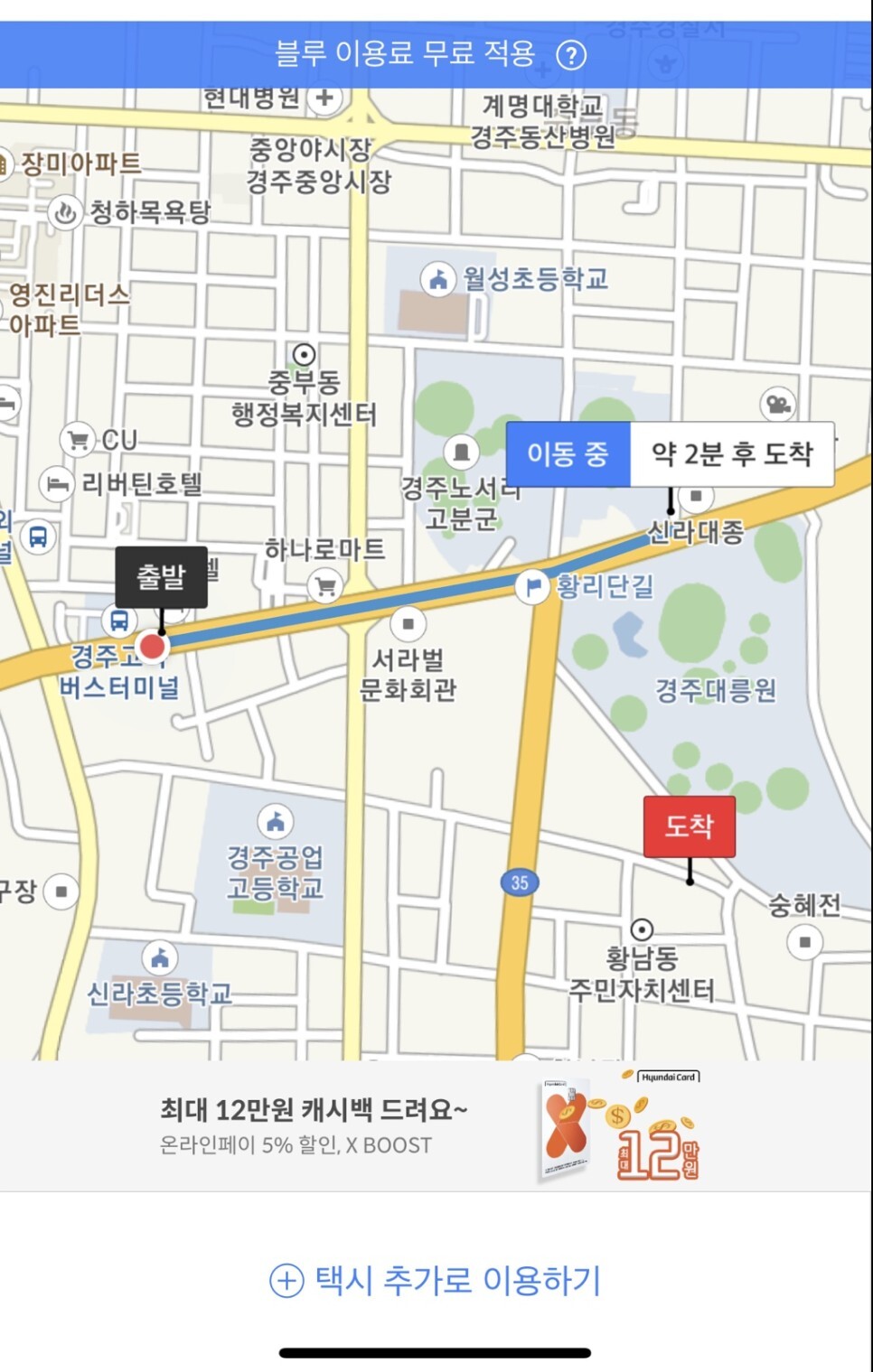 나는 버스 정류장에 갔다. 버스 도착 시간이 없었다. 10분을 기다렸지만 내가 탄 버스는 버스 표지판에 나타나지 않았다. 그래서 택시를 타기로 했다. 나는 고객을 구애하는 택시를 타지 않습니다. 카카오 T 블루는 경주에서도 이용 가능하다. 편안하고 쾌적합니다. 시골에서도 카카오 T와 함께 편안하게 여행하세요.