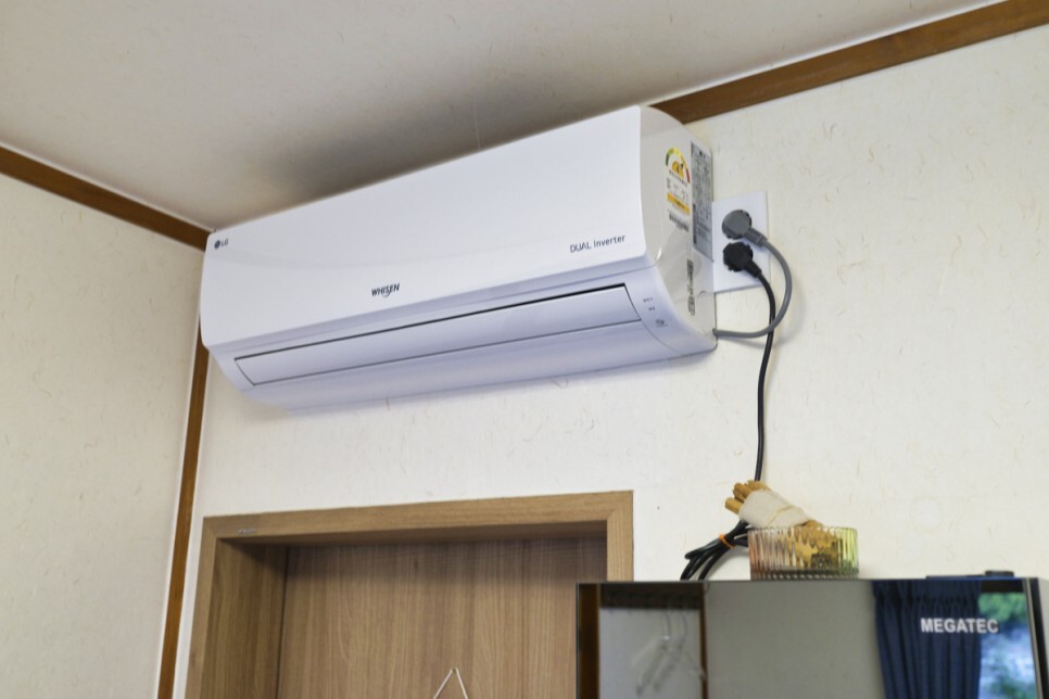 방은 성인 남성 3명 정도가 누울 수 있는 공간이다. 더블룸에 배정된 것 같습니다. 에어컨부터 테이블, 베개, 화장대, 거울까지 모든 것이 정성스럽게 준비되어 있습니다. 경주부부펜션답게 많은 것들이 준비되어 있습니다.