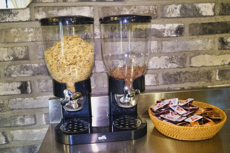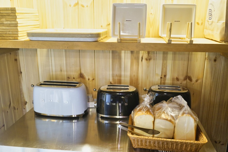 토스트, 커피, 오렌지 주스, 우유. 옥수수 프로스트, 잼, 버터 및 다양한 차를 사용할 수 있습니다. 왼쪽의 토스터는 큽니다. 한 번에 최대 4개까지 굽는다고 합니다.