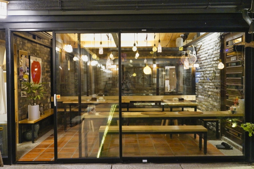 경주 황리단길 숙소는 해가 지고 조명이 켜지면 분위기가 좋다. 어때? 이런 분위기에서 나는 와인을 마셨다.