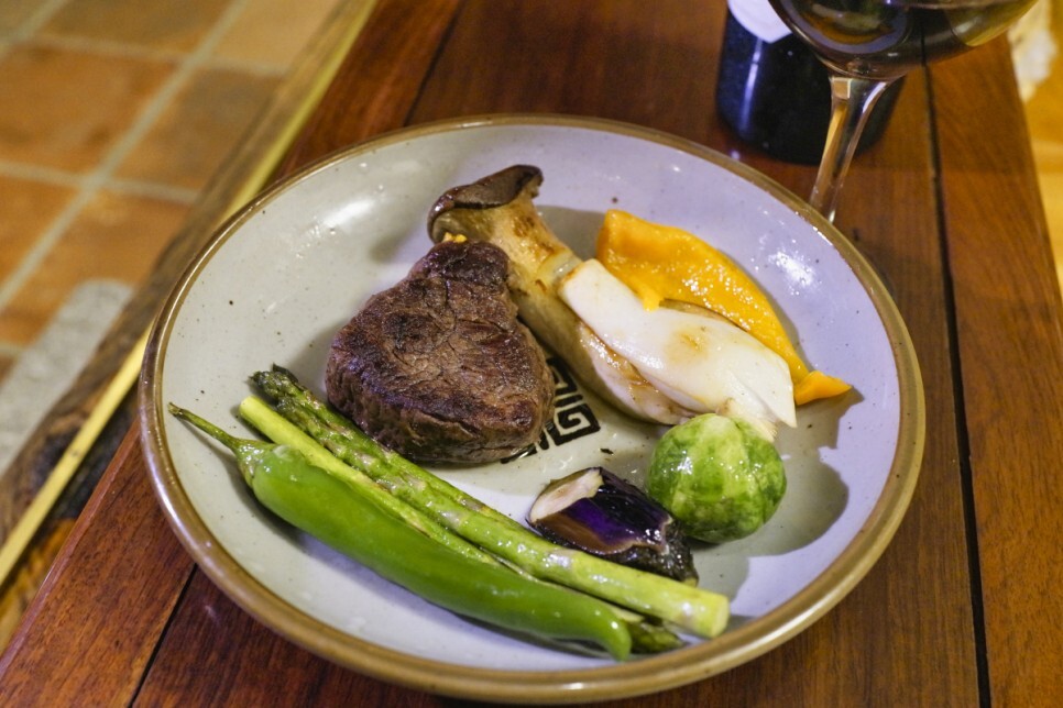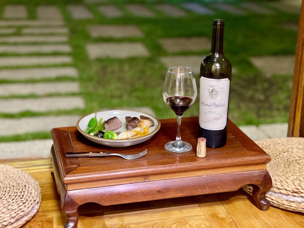 와인과 스테이크를 좋아합니다. 와인과 함께 마셨습니다. 한옥이 나무로 되어 있어서 불에 민감한 부분이 있었습니다. 요리도 정성스럽게 했습니다. 다음에 가면 그냥 치즈랑 와인 한병 들고 마루바닥에서 마시면 좋을 것 같아요. 사장님이 주신 와인잔.