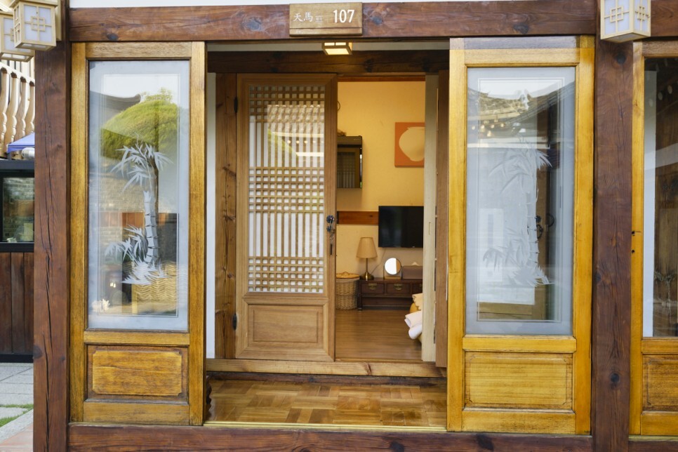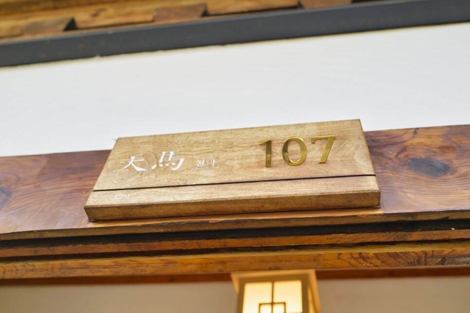 한옥집 같은 느낌이었어요. 인테리어 디테일도 좋았습니다. 문 손잡이에 걸려 있는 놋쇠 숟가락을 보세요. 어릴 때 시골집에 들어가 보면 흔히 볼 수 있는 것들이다. 그리고 107호실 이름은 천마라고 써있습니다. 천마총은 22대 지흥왕의 능이라고 한다. 이름을 따서 지은 것 같습니다.