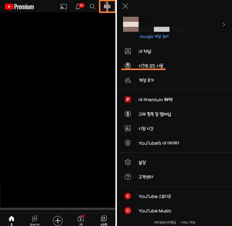 모바일 유튜브 시크릿모드 사용