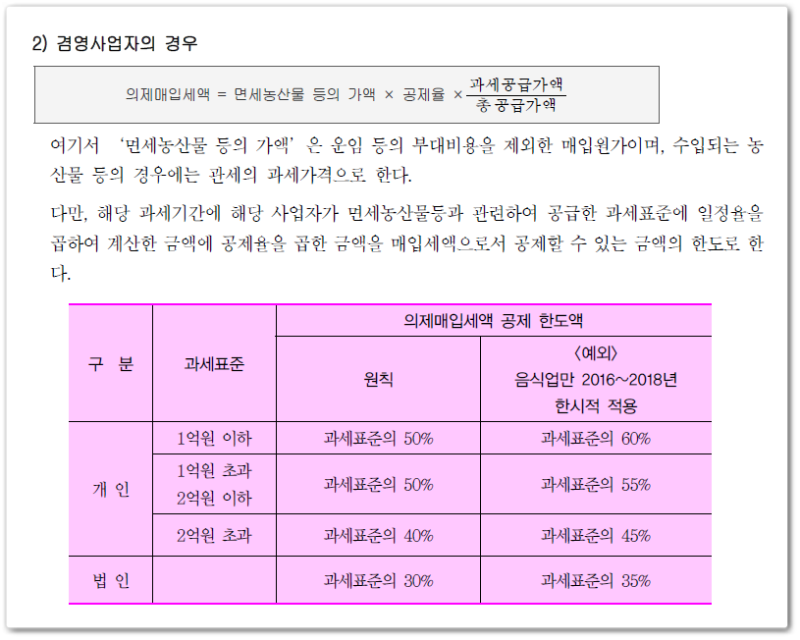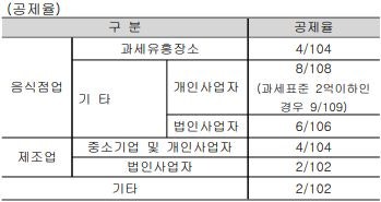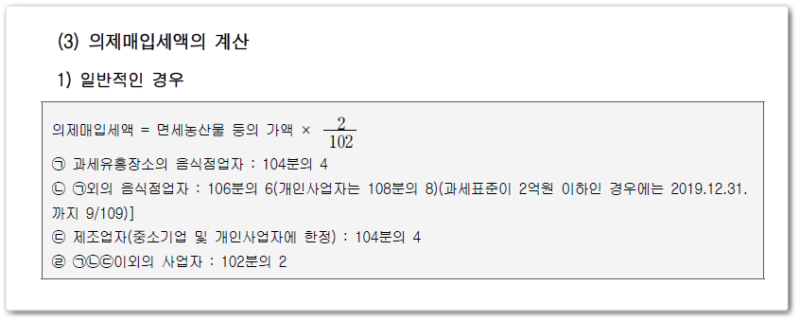 부가가치세 신고 시 신규사업자(7월 오픈)의 연간 환산이 궁금합니다. 7~12월 공급가액 5천만원(기준금액 8천만원) 사업자에 대한 단순세(기준금액 8천만원) 면제 9/109 잠정매입세액공제율 적용(과세표준 2 1억원) 원) 12월에 1억9천만원을 공급하는 식품사업자(답변)는 원칙적으로 연환산을 하지 않는다. 단순과세 면제기준금액, 납세의무 면제기준금액 등 연단위 환산이 필요한 경우에는 법률문에 ‘연도환산’이라는 문구를 기재한다. 한편, 질문하신 대로 과세표준이 2억 미만이면 매입세액공제율로 보는 9/109는 연환산 대상이 아니며, 부가가치세법상 연환산이 필요하지 않습니다. 답변이 업무에 도움이 되시기 바랍니다. (참고기사) 부가가치세법 제42조(면세농산물 등 가상구매에 대한 면세특례) 또는 제조․가공품 제공에 대하여 부가가치세가 과세되는 경우 임산물(이하 “면세농산물등”이라 한다)을 원료로 하여 생산한 제품(제28조에 따른 면세 및 영세율 적용은 제외한다) 가. 면세농산물등을 공급 또는 수입한 것으로 보아 아래 표의 구분된 세율을 곱하여 산출한 금액)을 매입세액으로 공제합니다. 할수있다. <2017.12.19., 2018.12.31., 2019.12.31., 2021.12.8., 2022.12.31.>