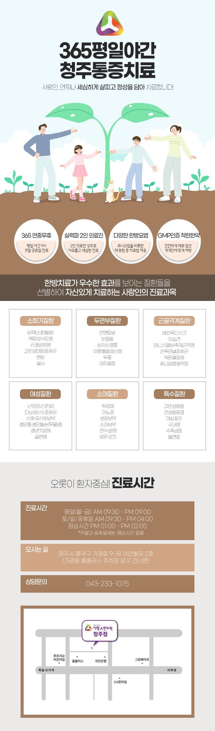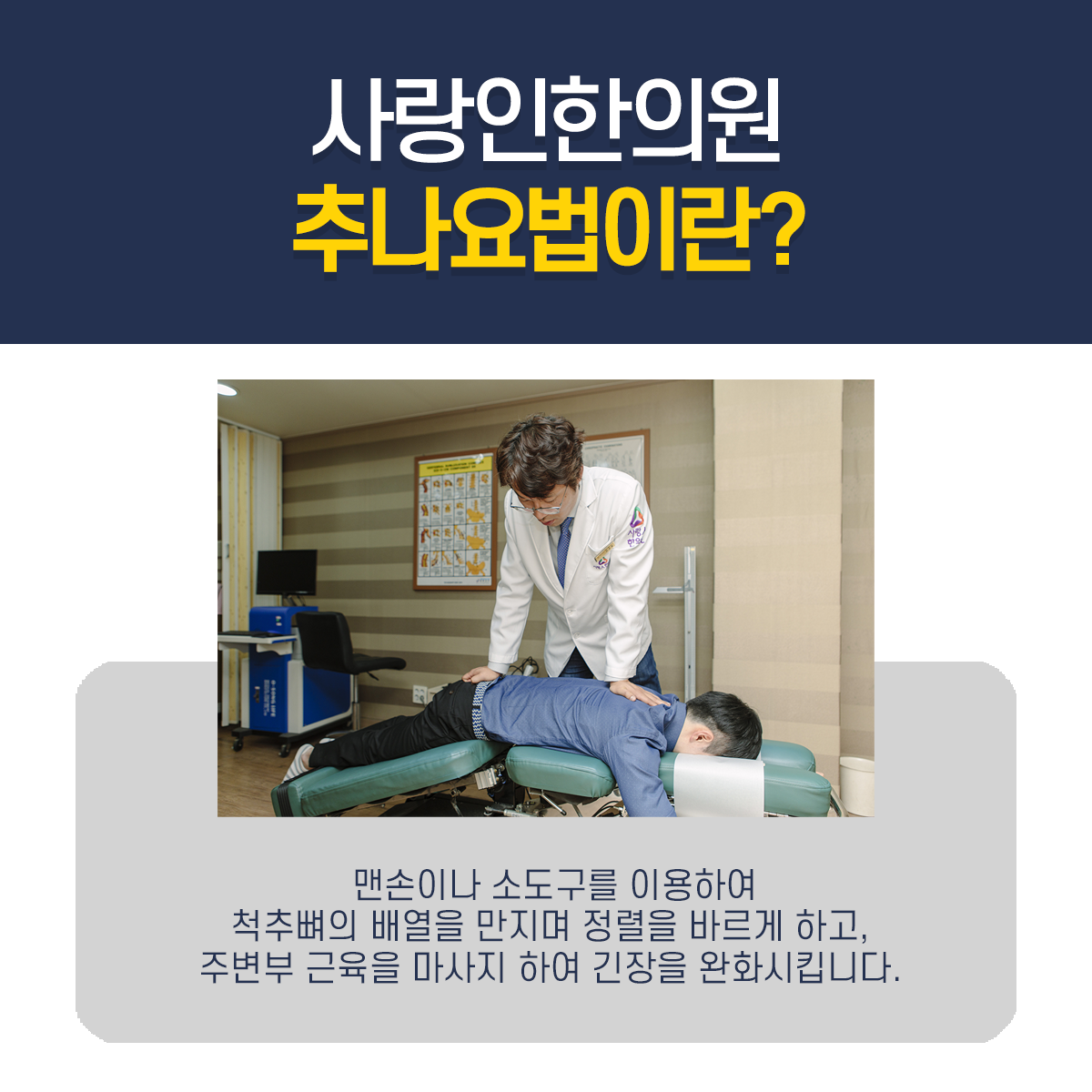 사랑인한의원 청주점에서는 허리디스크, 경추디스크 등의 근골격계 질환은 물론 근육통, 관절염, 골반통, 소화기 질환 등의 질환을 치료하기 위한 다양한 한방케어 프로그램을 제공하고 있습니다. 추나테라피에서는 한의원이 직접 척추를 바로잡고 신경압박을 풀어 근골격계 질환에 도움을 줍니다.
