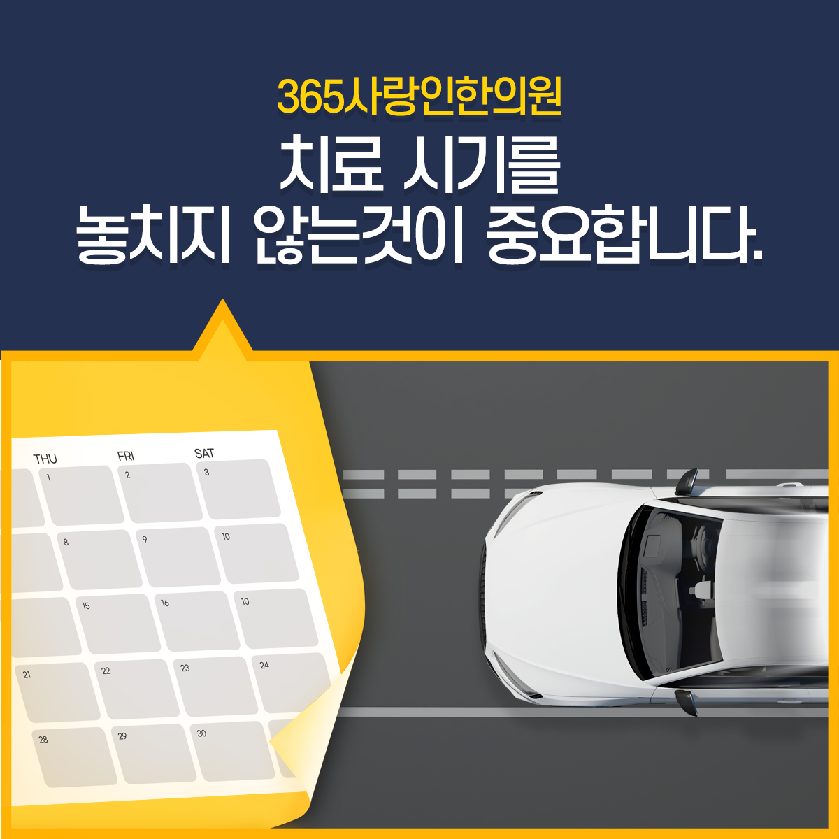자동차 사고의 무서운 점은 여파가 며칠 또는 몇 주 안에 발생할 수 있다는 것입니다. 교통사고 후유증은 전신에 다양한 증상으로 나타나기 때문에 성화동 홀리데이한의원 에서 빠른 진단을 받아 치료를 진행하시는 것이 바람직합니다. 주말, 공휴일에 갑자기 일어날 수 있는 교통사고! 성화동 홀리데이한의원에서 적절한 한방치료를 받으시고 빠른 회복하시길 바라겠습니다.