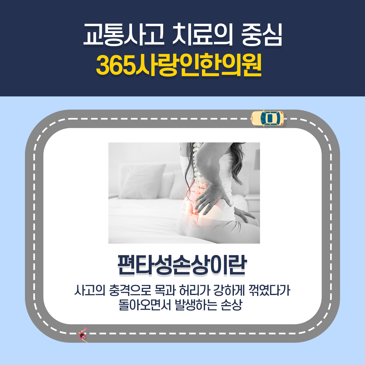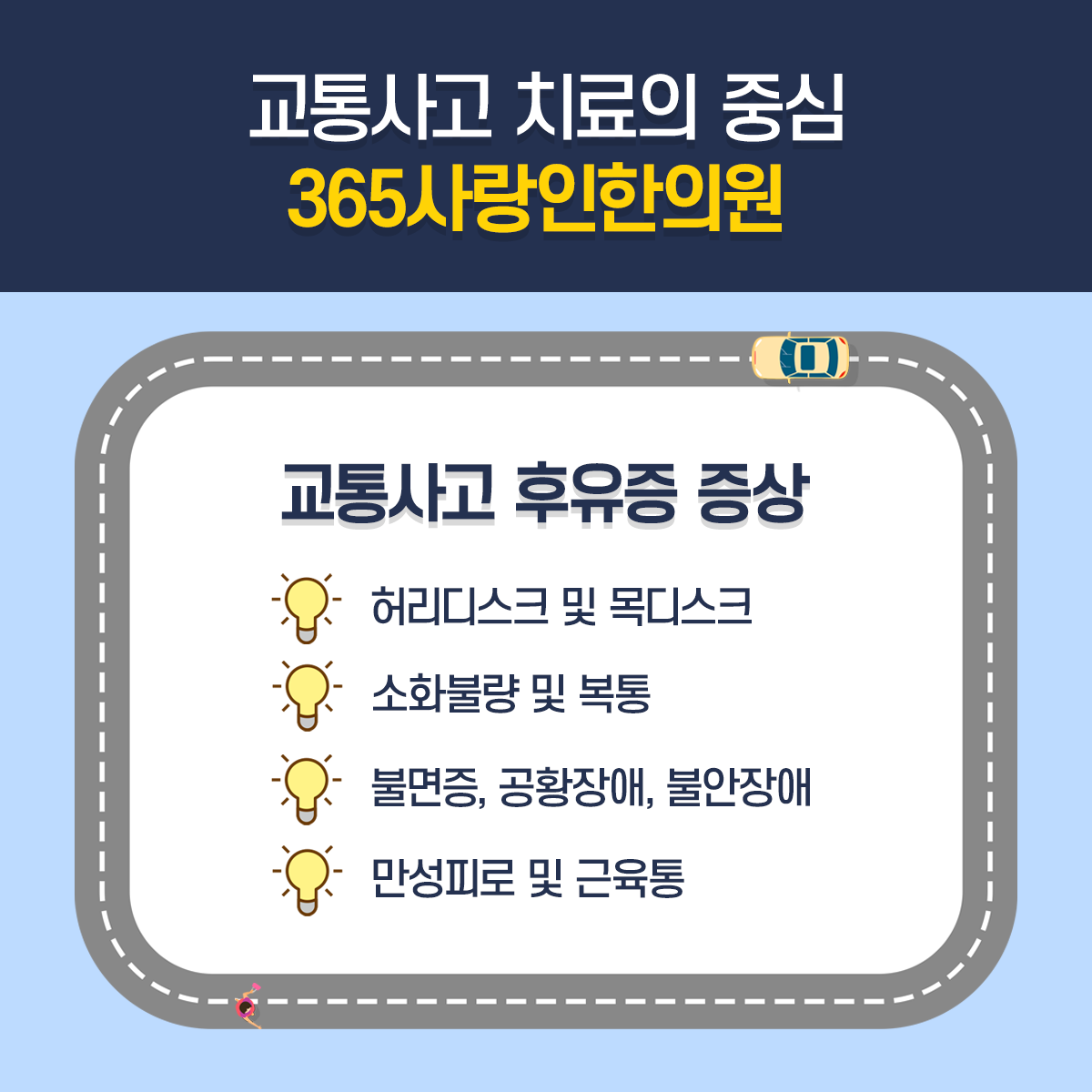 교통사고는 언제 일어날지 모르니 항상 조심하셔야 합니다. 다만, 타인의 실수로만 발생할 수 있는 문제이기 때문에 교통사고를 당하셨다면 주저하지 마시고 병원에서 치료를 진행하시길 바랍니다. 사랑인한의원은 365일 정확하고 정직한 진료를 약속합니다.