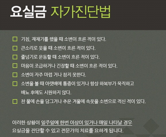 요실금은 본인의 의지와 상관없이 소변을 보게 되는 질환으로, 이유 없이 배뇨하는 진성 요실금, 기침과 힘주어 힘을 주어 억지로 참는 복압성 요실금, 방광에 소변이 차는 절박성 요실금 등이 있습니다. 또한 범람 요실금.
