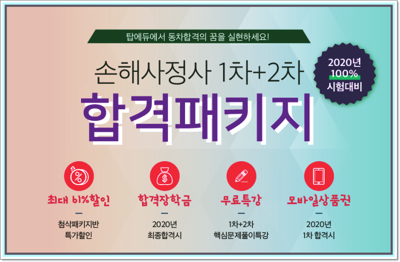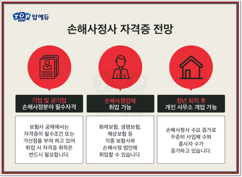 신체손해사정사 자격증을 취득한 후에는 대형 보험사부터 그 자회사, 그리고 원수사로부터 손해사정업무를 위탁받아 수행하는 손해사정법인을 비롯한 크고 작은 회사까지 다양하게 문호를 두드려볼 수 있고, 업무에 대한 지식과 경력을 쌓은 후에는 정식 개업을 통해 독립적인 손해사정사로서 커리어를 꿈꾸는 분들도 계신 만큼 ‘손해사정사 업무’ 자체에 매력을 느끼고 그만한 각오가 되시는 분들이라면 올해 시험일정을 통해 과감한 도전을 시작해보시길 바랍니다.손해사정사 시험일정은 보통 1차 시험이 4월, 2차 시험이 8월 정도에 시행되고 있으니 최대한 동차 합격을 노릴 수 있는 전략으로 남은 시간을 계획해나가야겠네요!효율 극대화가 필요한 1차 시험과 논리적 이해와 연습이 뒷받침돼야 하는 2차 주관식 시험까지.전반적인 기초 파악부터 시작하여 랜덤 모의고사 시스템 & 온라인 2차 첨삭반 운영으로 확실한 자동차를 노릴 수 있는 <톱/에/듀> 손해사정사교육원을 추천드리고 싶은데요. 홈페이지를 참고하시면 1:1 교육상담을 통해 손해사정사 시험에 대한 구체적인 학습 안내도 받으실 수 있으니 상세 링크를 통해 참고하시기 바랍니다!효율 극대화가 필요한 1차 시험과 논리적 이해와 연습이 뒷받침돼야 하는 2차 주관식 시험까지.전반적인 기초 파악부터 시작하여 랜덤 모의고사 시스템 & 온라인 2차 첨삭반 운영으로 확실한 자동차를 노릴 수 있는 <톱/에/듀> 손해사정사교육원을 추천드리고 싶은데요. 홈페이지를 참고하시면 1:1 교육상담을 통해 손해사정사 시험에 대한 구체적인 학습 안내도 받으실 수 있으니 상세 링크를 통해 참고하시기 바랍니다!효율 극대화가 필요한 1차 시험과 논리적 이해와 연습이 뒷받침돼야 하는 2차 주관식 시험까지.전반적인 기초 파악부터 시작하여 랜덤 모의고사 시스템 & 온라인 2차 첨삭반 운영으로 확실한 자동차를 노릴 수 있는 <톱/에/듀> 손해사정사교육원을 추천드리고 싶은데요. 홈페이지를 참고하시면 1:1 교육상담을 통해 손해사정사 시험에 대한 구체적인 학습 안내도 받으실 수 있으니 상세 링크를 통해 참고하시기 바랍니다!효율 극대화가 필요한 1차 시험과 논리적 이해와 연습이 뒷받침돼야 하는 2차 주관식 시험까지.전반적인 기초 파악부터 시작하여 랜덤 모의고사 시스템 & 온라인 2차 첨삭반 운영으로 확실한 자동차를 노릴 수 있는 <톱/에/듀> 손해사정사교육원을 추천드리고 싶은데요. 홈페이지를 참고하시면 1:1 교육상담을 통해 손해사정사 시험에 대한 구체적인 학습 안내도 받으실 수 있으니 상세 링크를 통해 참고하시기 바랍니다!효율 극대화가 필요한 1차 시험과 논리적 이해와 연습이 뒷받침돼야 하는 2차 주관식 시험까지.전반적인 기초 파악부터 시작하여 랜덤 모의고사 시스템 & 온라인 2차 첨삭반 운영으로 확실한 자동차를 노릴 수 있는 <톱/에/듀> 손해사정사교육원을 추천드리고 싶은데요. 홈페이지를 참고하시면 1:1 교육상담을 통해 손해사정사 시험에 대한 구체적인 학습 안내도 받으실 수 있으니 상세 링크를 통해 참고하시기 바랍니다!