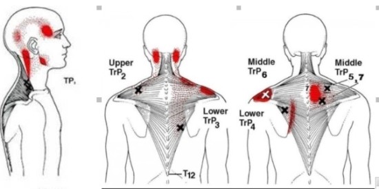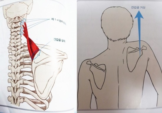견갑거근의 X부위가 통증유발점이며 붉은색 부분이 방사통의 X위치에 위치하여 이를 완화시킬 수 있습니다.
