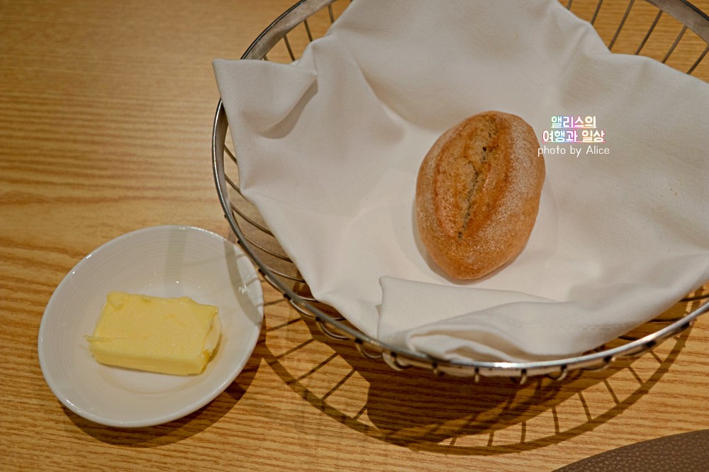 피곤해서 웰컴 드링크로 와인 대신 오렌지 주스를 골랐다. 그리고 식전 빵과 버터가 나왔다. 버터는 무염버터
