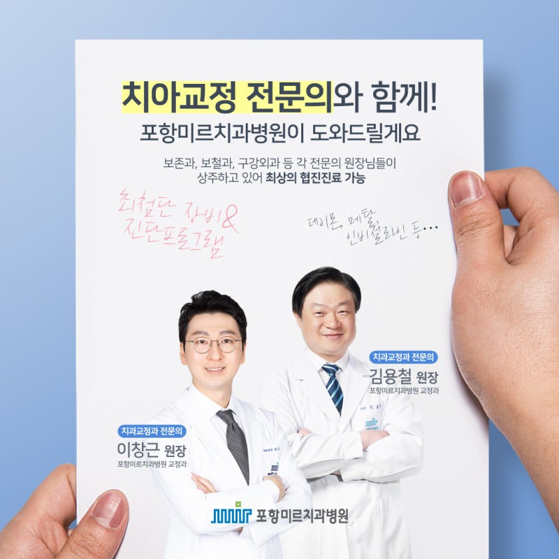 교정 치료를 통해 개선된 치아가 오랫동안 유지되도록 리테이너를 착용하십시오.교정치료를 시작하려면 정밀검사와 충분한 상담이 필요합니다.또한 교정치료는 환자협조를 위한 중요한 치료법으로, 치료 시 의료진의 지도와 주의사항을 참고하고 따라야 합니다.경북 포항시 북구 포스코대로 288 미르치병원경북 포항시 북구 포스코대로 288 미르치병원일반 성인치료(5-9층) 개인교정학과(8층) / 소아과(9층