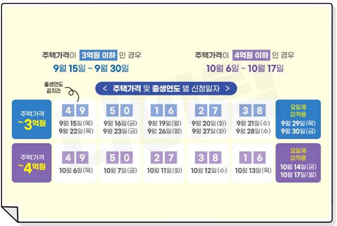 신청기간은 순차 적용하며, 배당방식은 주택가격 기준(3억원/4억원 미만 보유)