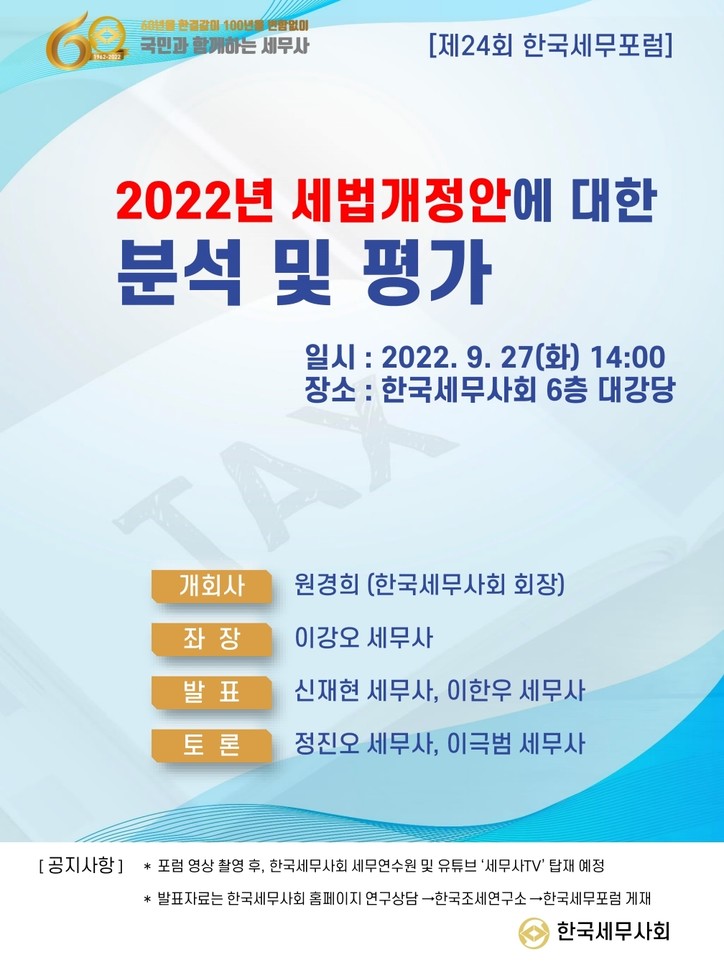 한국세무사회 이달 27일 제24차 한국세포럼 개최… 2022년 세법개정안 분석 및 평가 김승현 기자([email protected]) | 승인 : 2022.09.21 18:01 * 출처 : 세종일보(https://www.sejungilbo.com/news/articleView.html?idxno=39412))