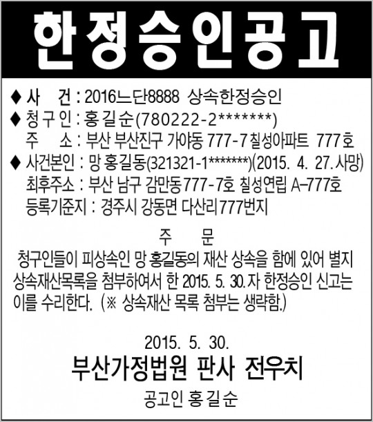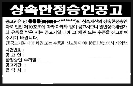 제한된 배치 보고서를 발행하지 않는 경우? ? 어떤 사람들은 상속 재산이 거의 없거나 채권자를 알고 있기 때문에 제한된 승인 보고서를 발행하지 않습니다. 공지를 꼭 올려주세요. ★★★★★ 제한된 인가 신문에 공고문을 게재할 경우 금액이 크더라도 변제 의무가 없으므로 반드시 공고문을 게시하여야 함을 잊지 마시기 바랍니다.