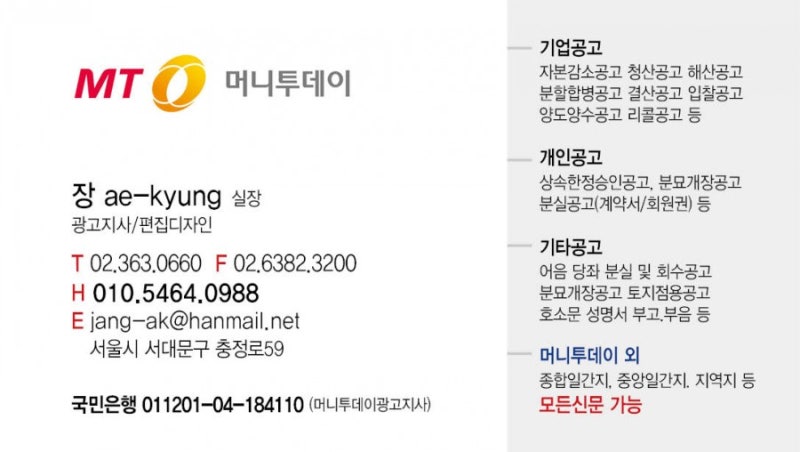 우리는 신문 게시판을 전문으로 하며, 많은 발표를 위해 전국의 중앙 일간지 및 지역 일간지와 협력합니다. 따라서 혼자 하는 것보다 비용 부담을 많이 줄일 수 있다. . 20년 이상의 경력을 가진 홍보 전문가들이 모든 과정을 안전하게 처리해 드리고 있으니 걱정하실 필요가 없습니다.