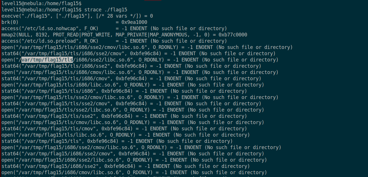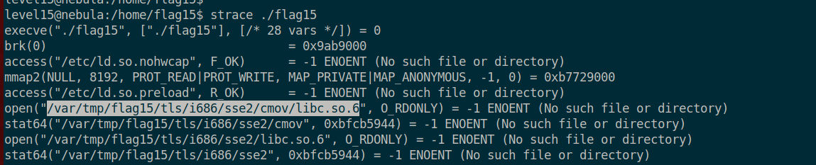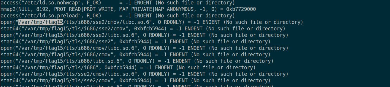 strace와 함께 flag15를 실행하면 종종 “No such file or directory”가 반환됩니다.리눅스에서 “해당 파일이나 디렉토리가 없습니다” 이 오류는 찾고 있는 파일을 찾을 수 없을 때 발생합니다. 이러한 오류의 공통점은 결국 C에서 사용되는 공유 라이브러리입니다. libc.so.6을 찾고 있다는 사실과 무엇을 찾고 있는지 libc.so.6의 모든 경로는 “/var/tmp/flag15/tls”의 하위 경로입니다.