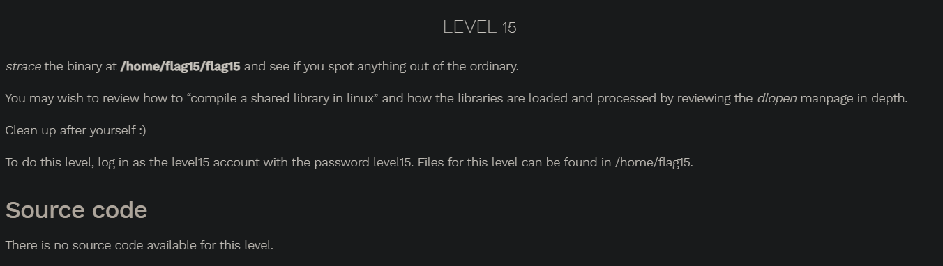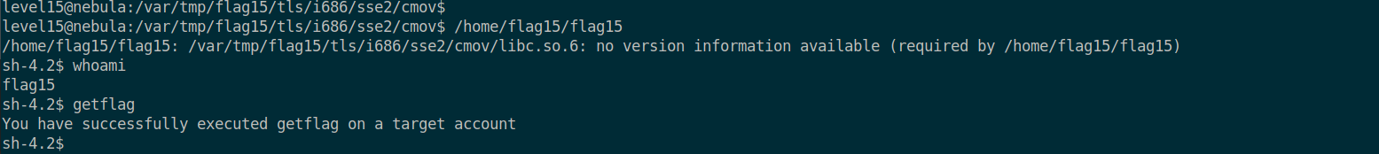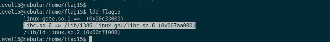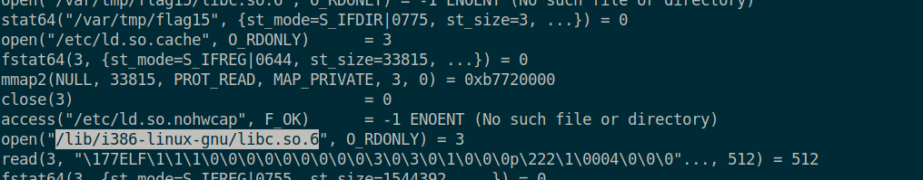 flag15는 공유 라이브러리를 찾기 위한 경로인 RPATH에 지정된 대로 strace로 처음 실행되었을 때 /var/tmp/flag15 디렉토리에서 순차적으로 검색했고 결과적으로 ldd, /lib/i386- The shared The library used는 linux-gnu 디렉토리에서 발견되었습니다.