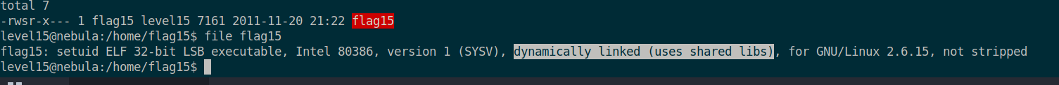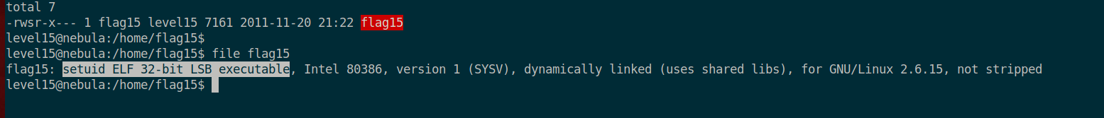 Flag15 홈 디렉터리에서 setuid가 설정된 동적으로 연결된 32비트 Linux 실행 파일이어야 합니다. 또한 제거되지 않으므로 파일 아이콘을 볼 수 있습니다.