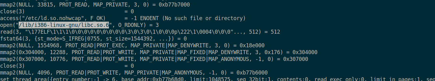 strace 결과를 계속 따라가다 보면 마침내 /lib/i386-linux-gnu 디렉토리에서 libc.so.6 공유 라이브러리를 찾을 수 있고 오류가 발생하지 않는 것을 확인할 수 있습니다.